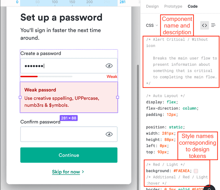 If you select components, their names and descriptions appear as code comments. Similarly, the names of selected styles appear as comments, which can help you determine which design tokens to use.